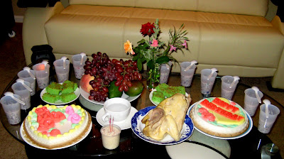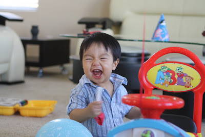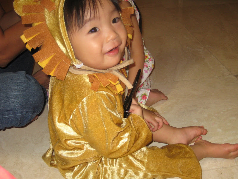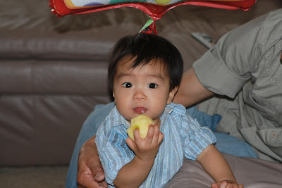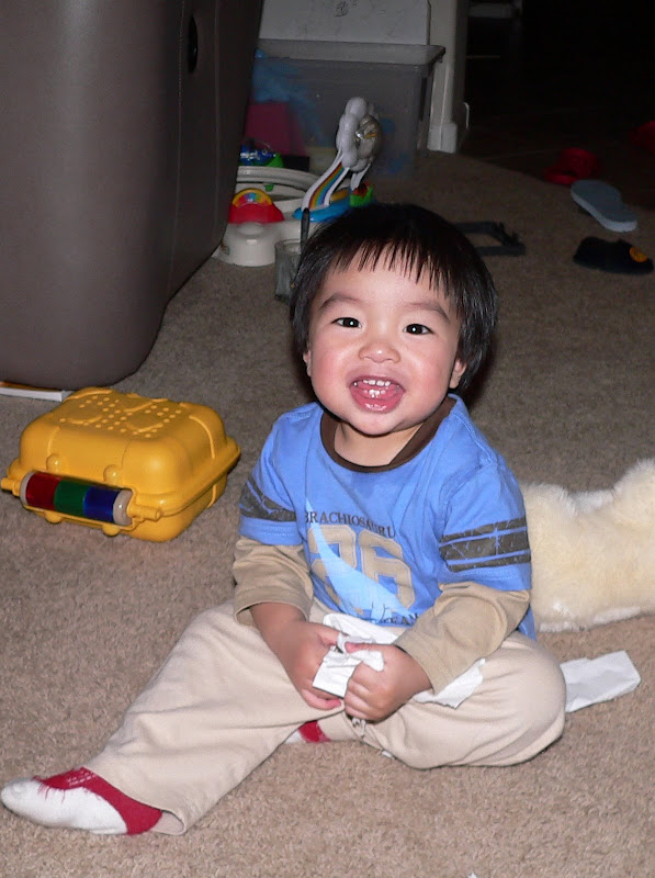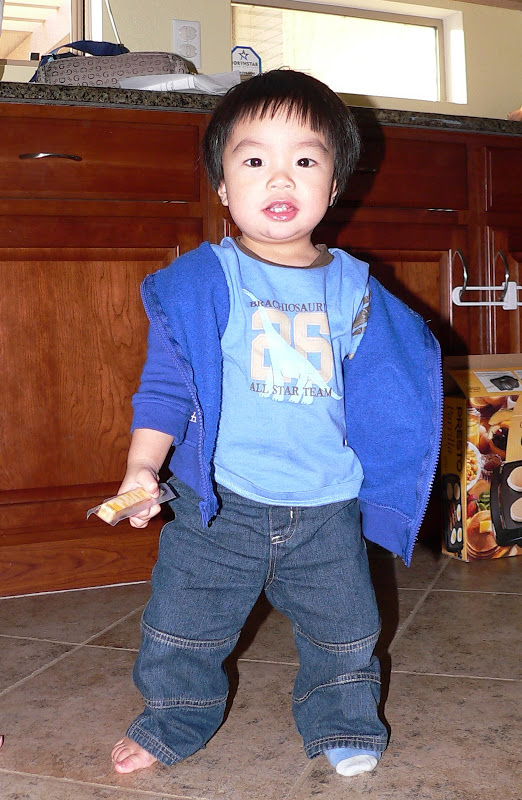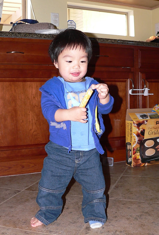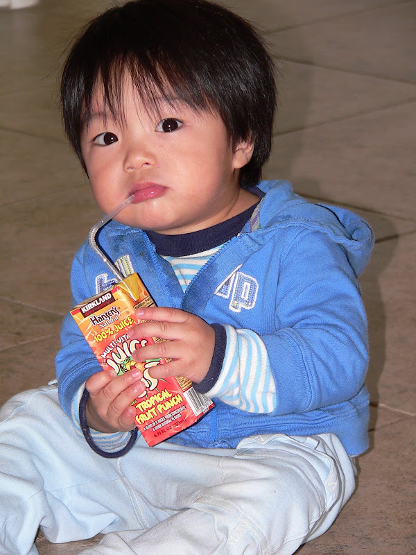 Em cũng đã ăn được hầu hết tất cả thức ăn của người lớn, và bây giờ hầu như không phải nấu thức ăn riêng cho em nữa mà cho em ăn chung với cả nhà. Sáng thì em ăn sữa và cereal, bánh mì, hoặc khi nào mẹ chăm chỉ thì cheese crisp, pancake... Trưa và tối ăn cơm, mì, bún, phở, bánh mì...,thịt, cá, đậu phụ, rau... Ngoài ra mỗi ngày ăn thêm 1 hộp sữa chua, 1 cây cheese, 1 hoặc 2 loại hoa quả, chuối, cam, quýt, táo, lê, nho, dâu... đều là khoái khẩu của em. Chỉ có điều em không chịu uống sữa, chỉ thích uống nước hoa quả, đặc biệt là nước cam. Tổng cộng vẫn chỉ 8 cái răng không hơn, mà em ăn giỏi thế!