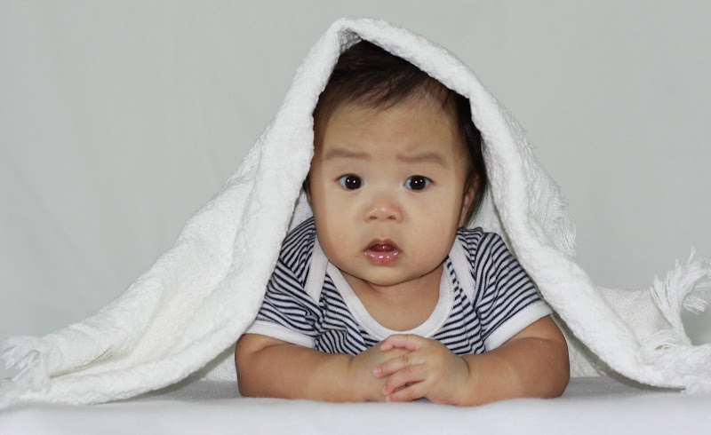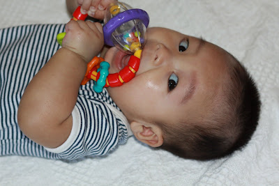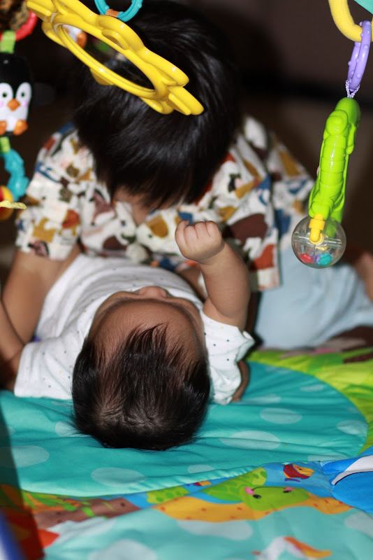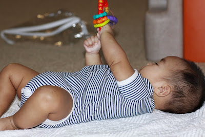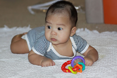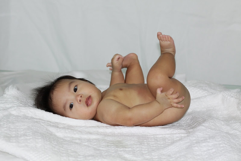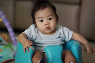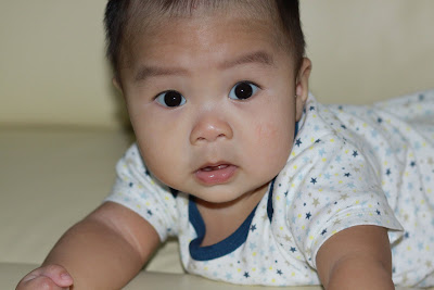 Em bé càng lớn càng dễ thương. 4 tháng rưỡi, em lẫy giỏi lắm rồi. Mỗi khi lẫy, em thường chổng mông lên mà đạp, nhưng em không trườn lên phía trước được mà toàn tụt về phía sau. Mẹ để em đứng ở cái jumperoo thì em nhảy tưng tưng thích thú. Em cũng đã biết cầm nắm đồ vật, đưa đồ chơi ra trước mặt là đôi bàn tay nhỏ xíu của em đã biết nắm lấy đầy tò mò thích thú. Những khi mẹ bận bịu, em ngồi đu hoặc bouncer một mình, tay mân mê đồ chơi, rất ngoan ngoãn, đôi khi em co chân đưa lên miệng mút chùn chụt. Những khi cả nhà ăn cơm, em ngồi Bumbo seat của em ê a, và nhìn bố mẹ và anh Điển ăn cơm mà "thèm" nhỏ dãi (thực ra là em có vẻ sắp mọc răng ấy mà). Đôi lúc, bố "thương tình" cho em ăn thử đào, thế là em gặm lấy gặm để, gặm một lúc mà vẹt mất một khúc miếng đào, đã thế tay em còn quào lấy tay bố để dúi miếng đào vào sâu hơn. Mẹ bảo, chắc là em sắp ăn dặm được rồi ấy nhỉ.